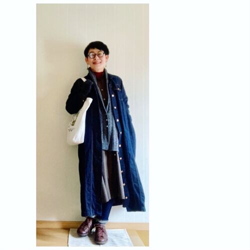 コート・フェリシモ ベスト・パドカレ ワンピース・ミズイロインド ボトルネックセーター・ecoloco ジーンズ・DMG 靴・トリッペン ピアス・ガラスのフランスビンテージビーズと山吹色のタッセルの耳かざり『renard(ルナール)』 | えふ この日は少し、暖か…