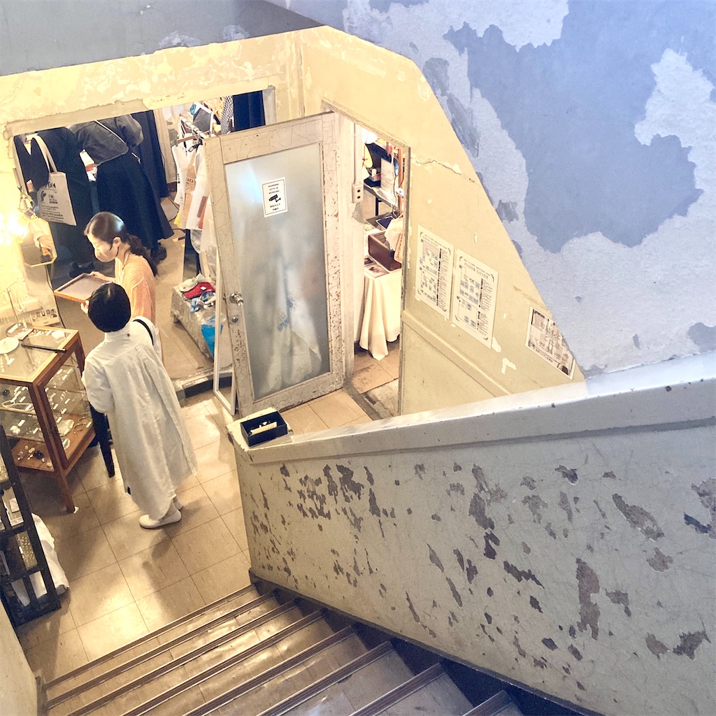 ビルは四階(プラス屋上)建てで、まず外観がステキ。内側も、このコンクリートの朽ち具合がなんとも言えない(*´ω`)とニヤついてしまう風情でした。一階あたり4~5つほど出店されていて、お客さんもちょっと入場するといっぱいになってしまう狭さ。そりゃあ確かに入場待ちの列ができるわけです。