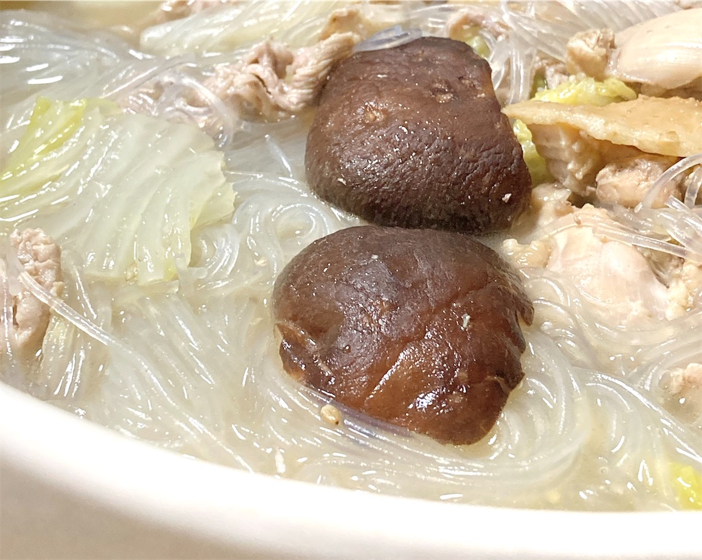 〈作り方〉戻した干しシイタケと戻し汁、ぶつ切りにした白菜、鶏もも、水を鍋に入れ煮込む。白菜が透明になったら豚バラを入れて火を通し、そこにスリゴマを入れる。食べる寸前に戻した春雨を入れ、さっと火を通す。